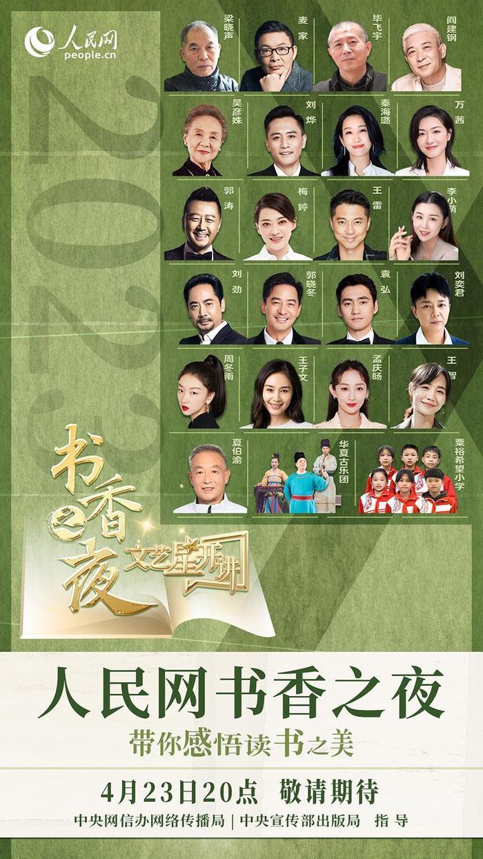 人间四月,与书相逢,人生漫漫,与书为伴。在第二十八个世界读书日到来之际,4月23日20点,由中央网信办网络传播局、中央宣传部出版局指导,人民网“文艺星开讲”将推出特别策划——书香之夜,邀请吴彦姝、刘烨、秦海璐、周冬雨、王雷、李小萌、郭涛、梅婷、万茜等文艺工作者,以及作家梁晓声、麦家、毕飞宇一起品味读书之美,感受经典文学作品的魅力。