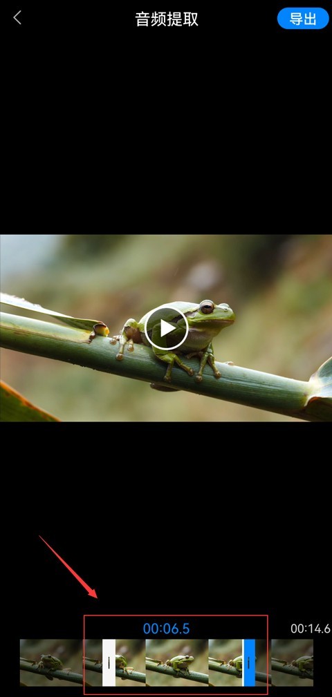 在操作界面下方,可以通过点击和拖拽视频进度条两侧的白色标记点,用于裁剪音频的时长,默认是转换整段视频的声音内容,选择完成,点击右上角“导出”;