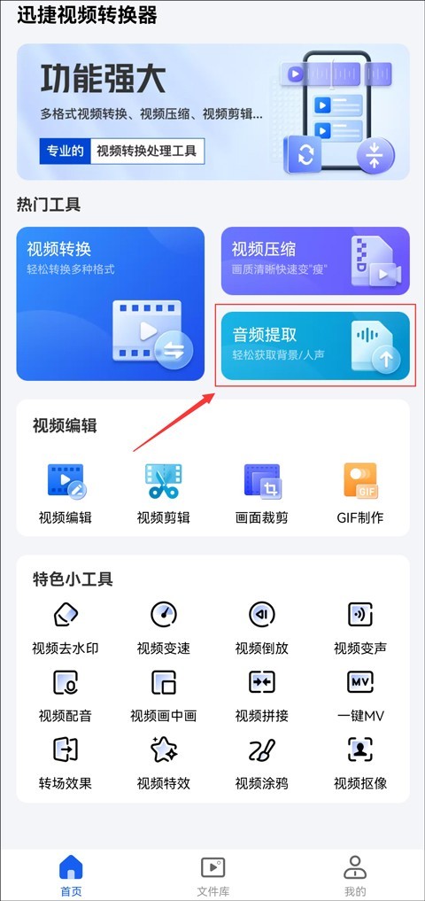 打开手机app操作界面,点击首页功能“音频提取”,可以轻松获取背景音乐及人物声音;