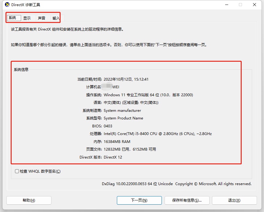确定以后弹出DirectX诊断工具。里面也有各种系统的信息介绍,比上面两个方法要更详细一点。