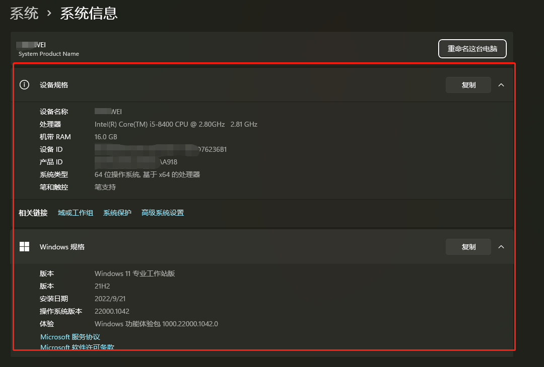 ···系统信息里面会有设备的名称、处理器型号、系统类型、Windows版本和内存大小等等。