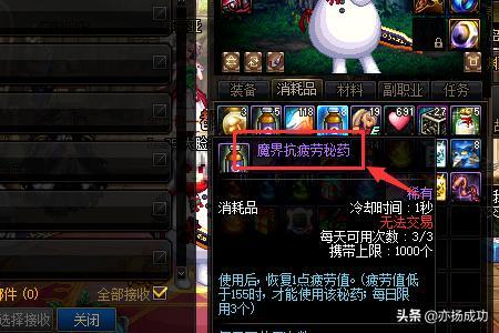 4,打开使用自己之前囤积的魔界抗疲劳秘药,增加自己的刷图机会,土豪朋友也可以直接前往商城购买相应道具。