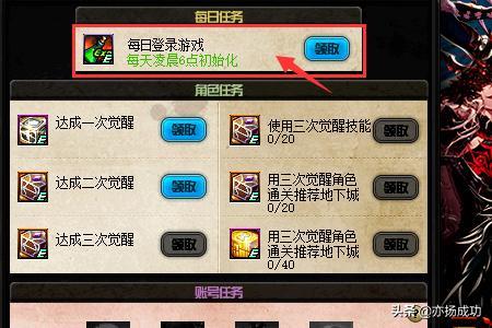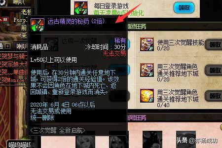 3,领取活动任务中的“三次觉醒”每日任务奖励,可以获取远古精灵的秘药,将升级经验翻倍。