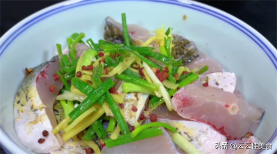 接下来准备一块生姜,切成姜丝,几根清洗干净的小葱,切成长段,放入鱼块里面。接着往里面加入一勺食盐,一勺胡椒粉,再倒入少量料酒去腥,然后把葱姜汁抓出来,这样才能激发出葱姜的香味,炸出来的鱼肉才更嫩更香。然后再撒入一把花椒,把鱼块抓拌均匀,让每一块鱼肉都能充分的吸收葱姜汁,这样腌出来的鱼肉肉质才更加鲜嫩好吃,而且一点腥味也没有。抓拌均匀后盖上一层保鲜膜,放冰箱冷藏腌制两个小时。