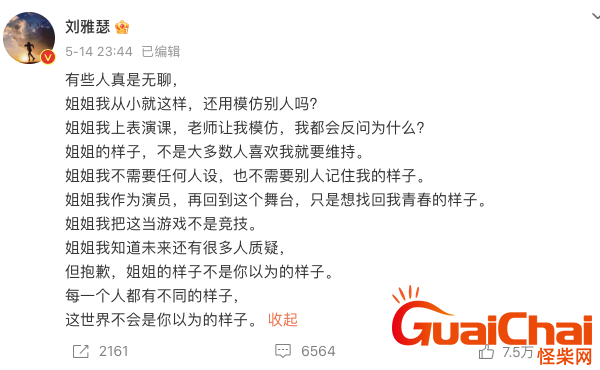 刘雅瑟大概是想复制李斯丹妮的路子走所谓的“总攻”人设的。从她的出场装扮到她和贾静雯的互动以及她一公时的表演,都透露着5个字:老娘我最帅,面对网友的吐槽她不像徐怀钰拉黑删评。直到有网友说她模仿李斯丹妮,她的心态才彻底崩了,连用了N个姐姐,强调自己从小就这样,还用模仿别人吗?