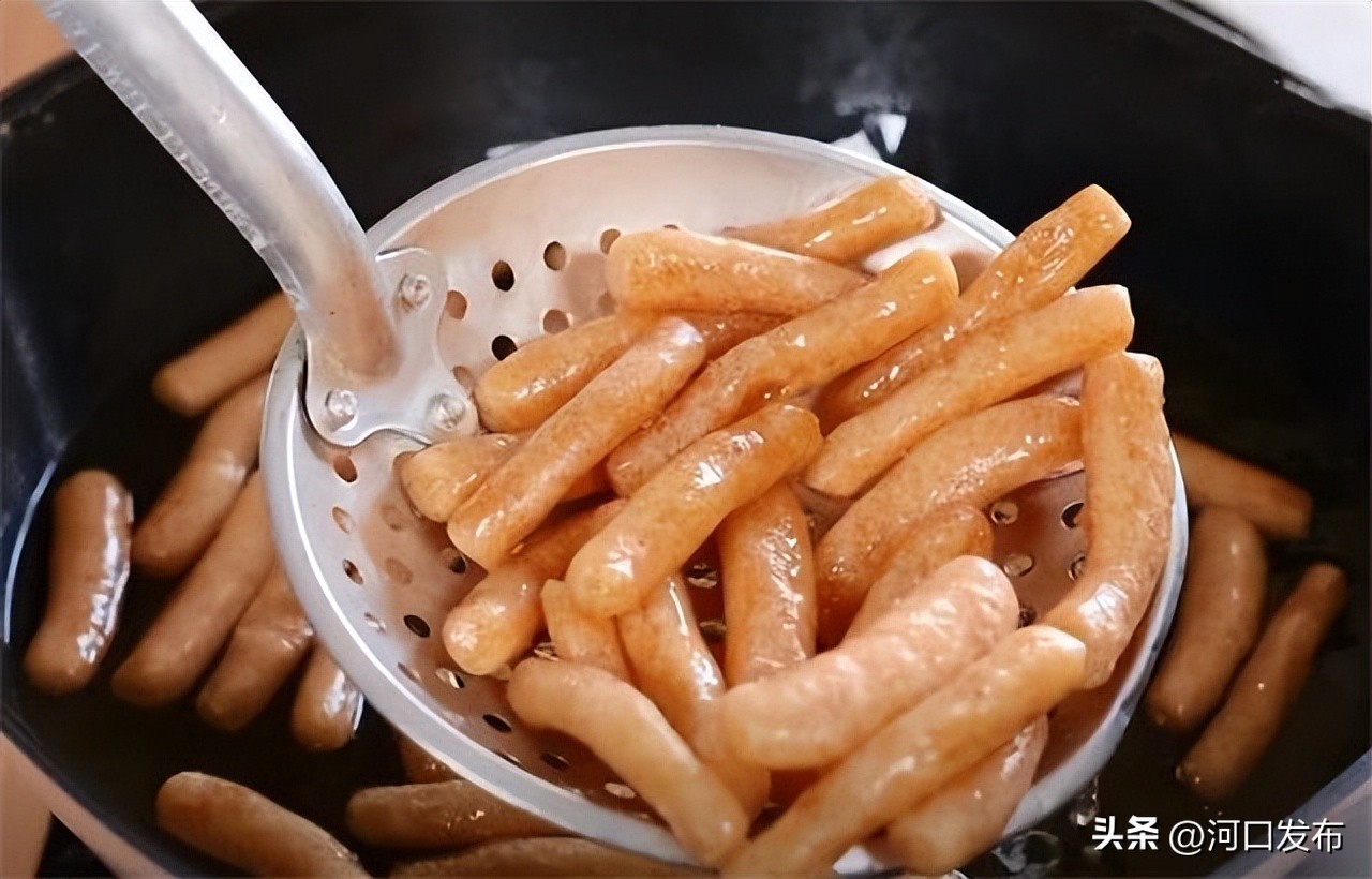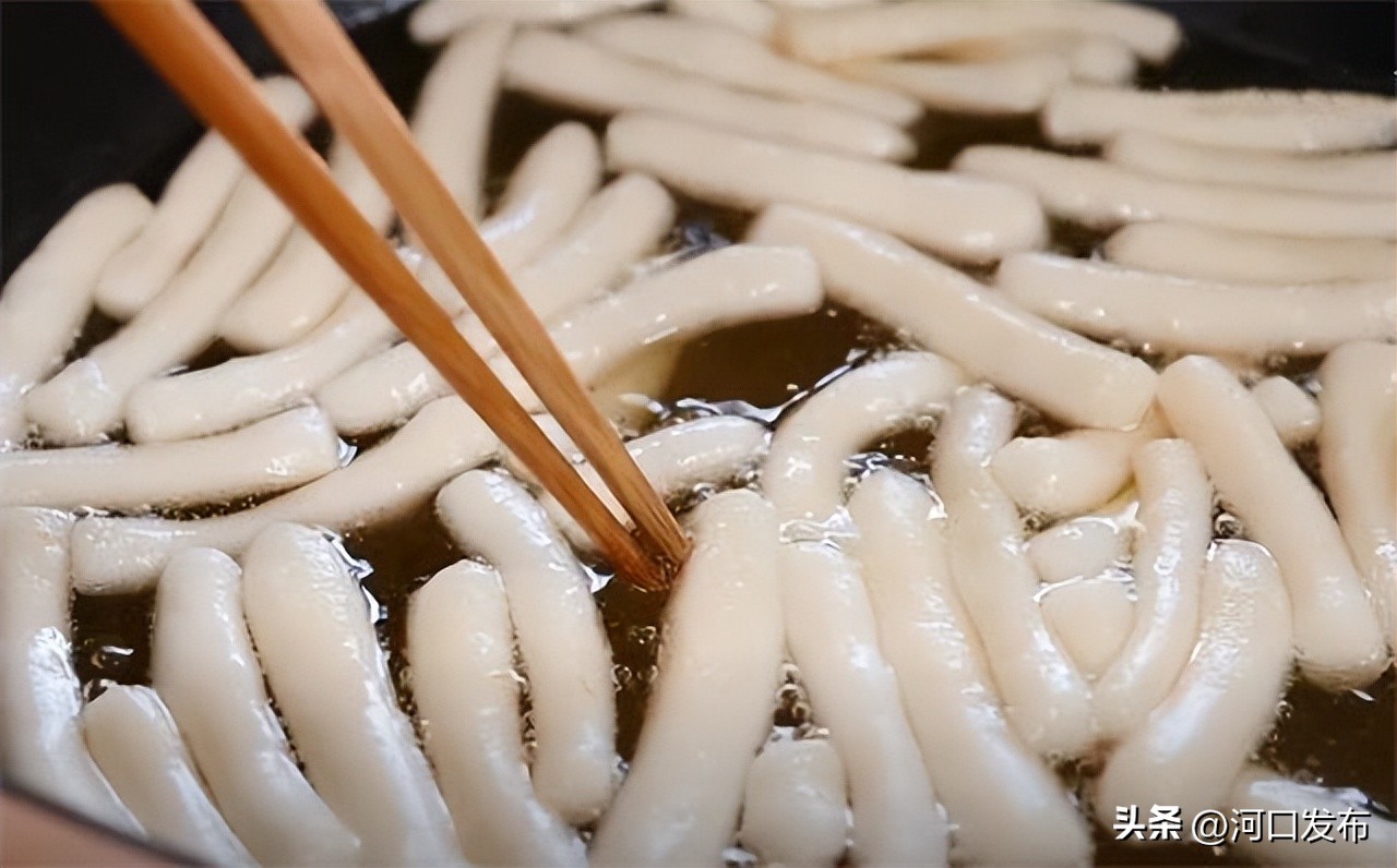 8.炸江米条的时候我们直接凉油下锅,慢慢的随着温度的升高,这个江米条会全部膨胀浮起来,这时候轻轻的去拨动它。