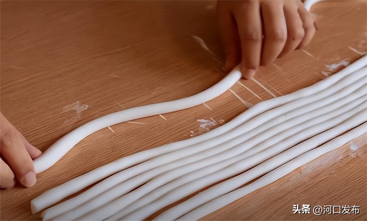 7.所有的长条都搓完之后我们开始切段。