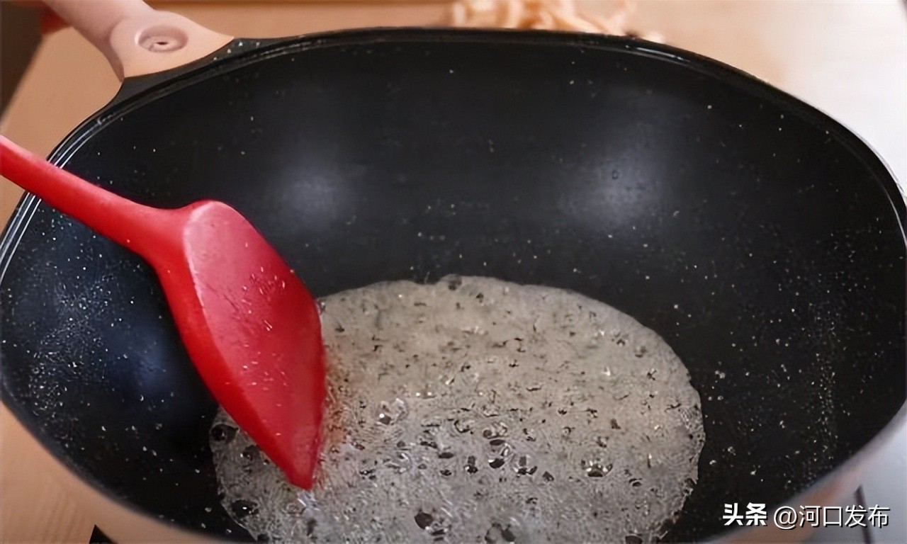 10.接着我们再来熬糖浆,50g的清水,60g白糖,把糖浆熬到非常浓稠,而且不断的冒气泡的时候,我们就要关火了。