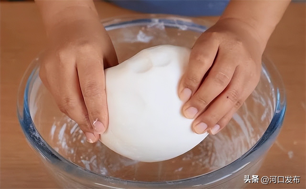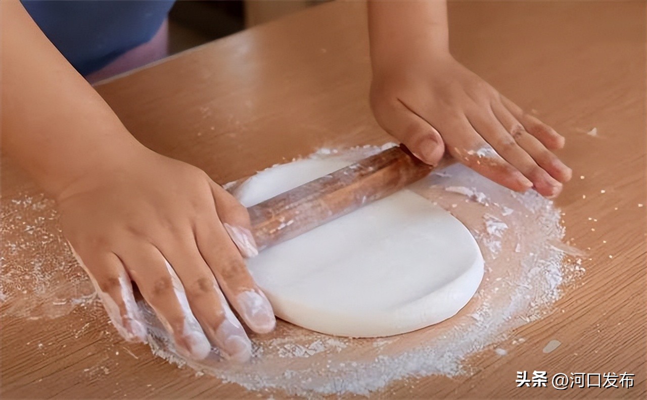 4.在案板上稍微的把它给搓圆了,整理一下形状,案板上撒些干面粉防粘,再用擀面杖擀开。
