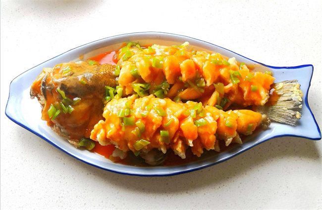糖醋鲈鱼外酥里嫩,酸甜可口,趁热食用口感最好。糖醋鲈鱼的制作方法稍微复杂一些,需要把洗干净的鲈鱼切去鱼头,再沿着脊骨把鱼肉用刀从鱼头片到鱼尾。另一面也要同样的操作,使鱼肉变成一条一条的挂在鱼脊骨上,再加入姜片、料酒、食盐、胡椒粉等调料抓匀腌制一会,裹上适当的淀粉,放入锅中油炸定型,表面焦黄后就要捞出来备用。再进行调糖醋汁,在锅中加入番茄酱、白糖、白醋和半碗清水大火煮开后加入适量淀粉水。煮至粘稠淋到鲈鱼上面就完成了,也可以撒上一些葱花和松子,起到提味和美观的作用。