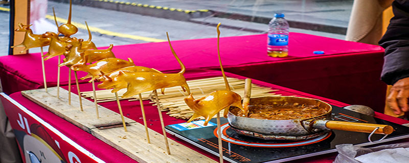 制作糖人是一种中国传统手工技艺,据说吹糖人技艺始于明末清初,制作时把糖稀熬好,用一根麦秸杆挑上一点糖稀,再对着麦秸杆吹气,糖稀随即像气球一样鼓起,最后通过捏、转等手法配合吹起塑成各种造型。