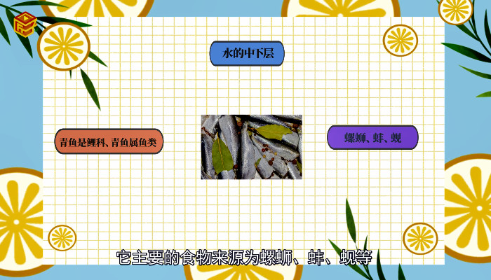 青鱼是鲤科、青鱼属鱼类,通常栖息在水的中下层,生性不活泼,它主要的食物来源为螺蛳、蚌、蚬等,偶尔也捕食虾和昆虫幼虫。