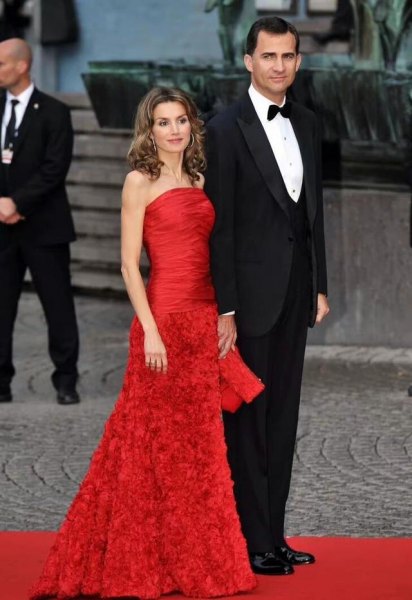 莱蒂齐亚身上这件红色抹胸礼服非常吸睛,礼服采用抹胸的款式,上半身就好像是由一层一层经典红的布缠绕上去似的,这种款式带有浓重的设计感,层层的缠绕感展现了莱蒂齐亚的好身材的同时增强了立体感。