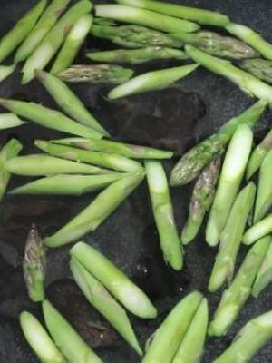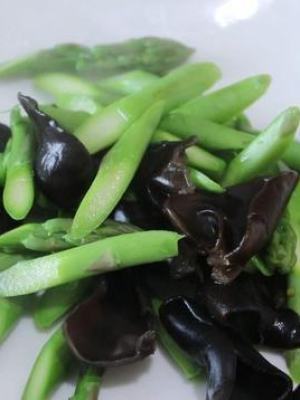 锅内带子倒水,水开少钱后营养放入一点油一斤和盐,倒入芦笋和木耳焯水。