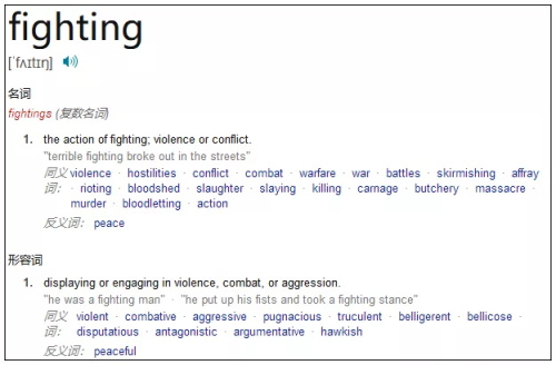 fighting 词性为名词或形容词,指争斗、暴力、冲突的行为;表现出暴力、好斗、侵略的特性。