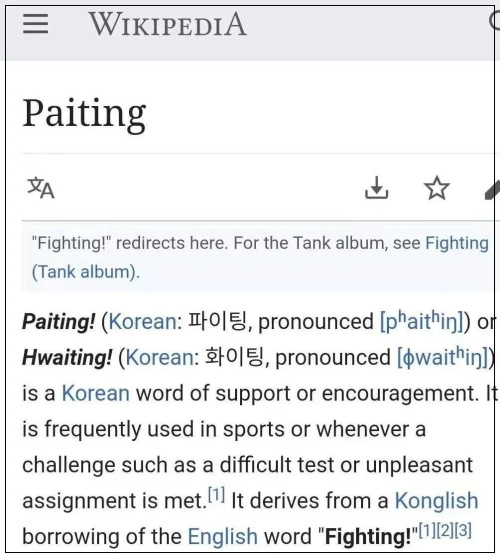 paiting 即韩语 ???。根据维基的解释,现在我们国内说 fighting 给人加油,说的都是韩式英语。