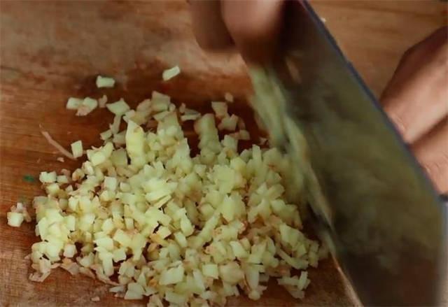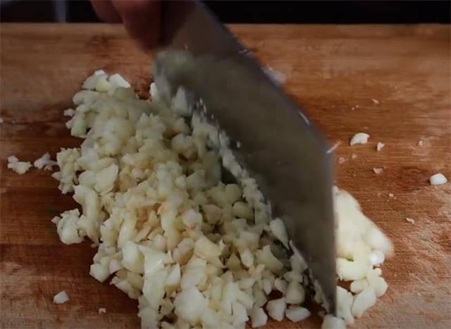 9.再多剥一些大蒜,先用刀把蒜拍扁,然后全部切成蒜末,这个大蒜也要提前洗净晾干水分。