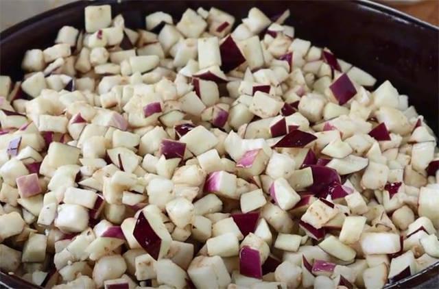 3.茄子晾干水分后,先把茄子的蒂去掉,把茄子切成厚一些的片,最后把茄子切成小块,切好的茄子装入盆里面,然后往盆里加入盐,直接用两手翻拌均匀,让这些茄子都均匀地沾上盐,茄子搅拌均匀后放一旁腌半个小时左右,杀出茄子里面的水分。