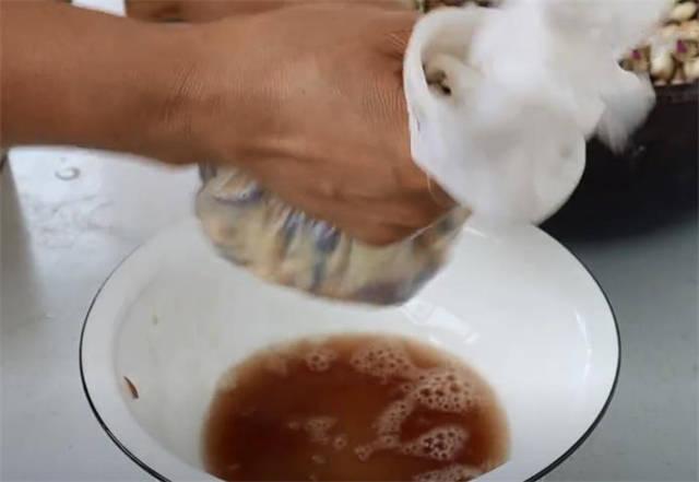 5.这会儿茄子腌好了,已经杀出来很多的水分,然后用纱布把茄子包住,使劲挤出茄子里面的水分。