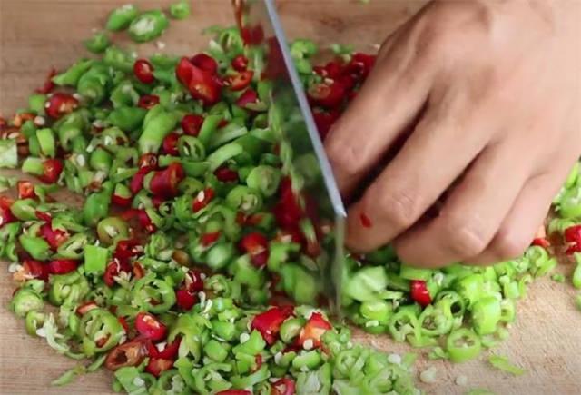 7.辣椒晾干水分后,挨个把辣椒的蒂都掰掉,再把辣椒全部切成小圈,腌茄子这里的辣椒可以根据自己的口味来添加,我家里人比较能吃辣,所以我放的辣椒比较多,再顺便把辣椒切得碎一些。