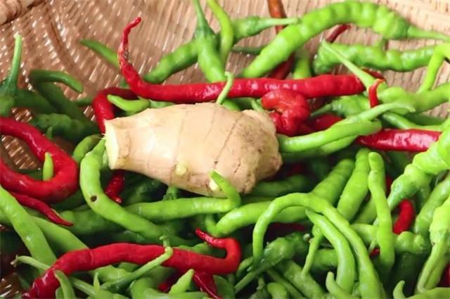 2.顺便再准备一些青红辣椒,把辣椒也清洗干净,辣椒洗干净后也放在透气的工具上面晾干水分,顺便洗一块生姜也晾干水分。