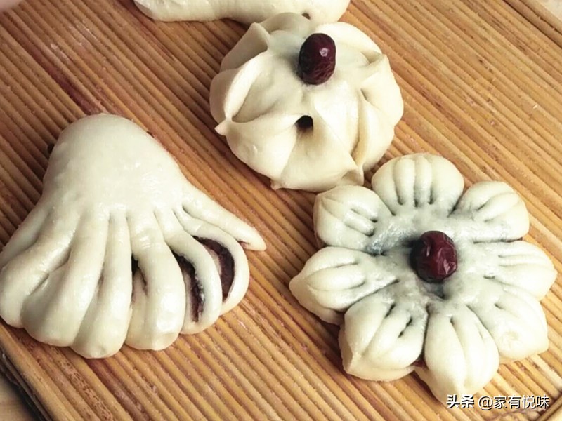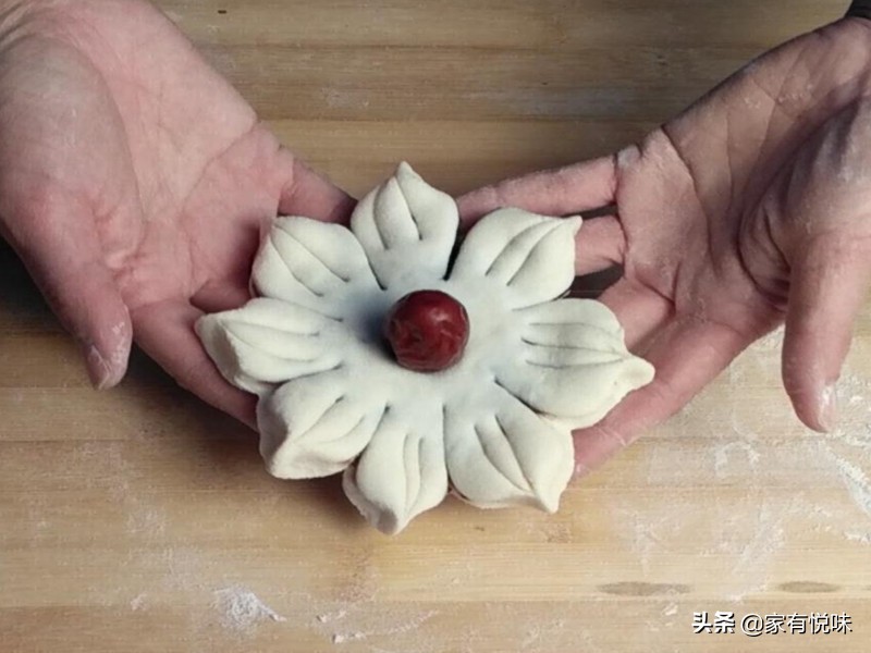 3、 整理一下使其更生动,最后也是放上一颗红枣做花蕊点缀一下,这样这款花样豆沙包就做好了。
