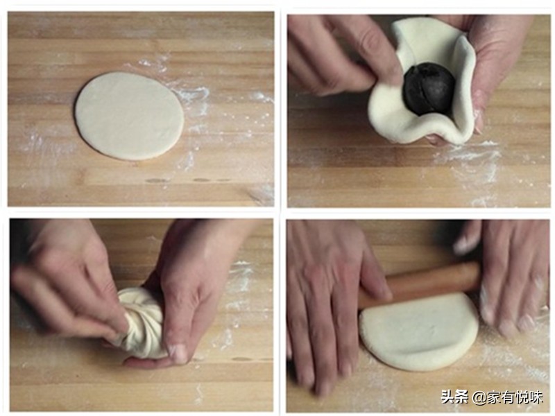 1、 将揉圆的面剂擀成中间稍厚,边缘稍薄的包子皮,放入事先准备好的豆沙馅,像包包子一样把它包起来。注意要一边捏皱褶,一边挤压掉里面的空气。