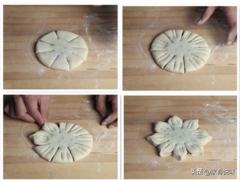 3、 擀好后再用刀如图这样分割,并压上花纹,再用手捏成花瓣的形状。