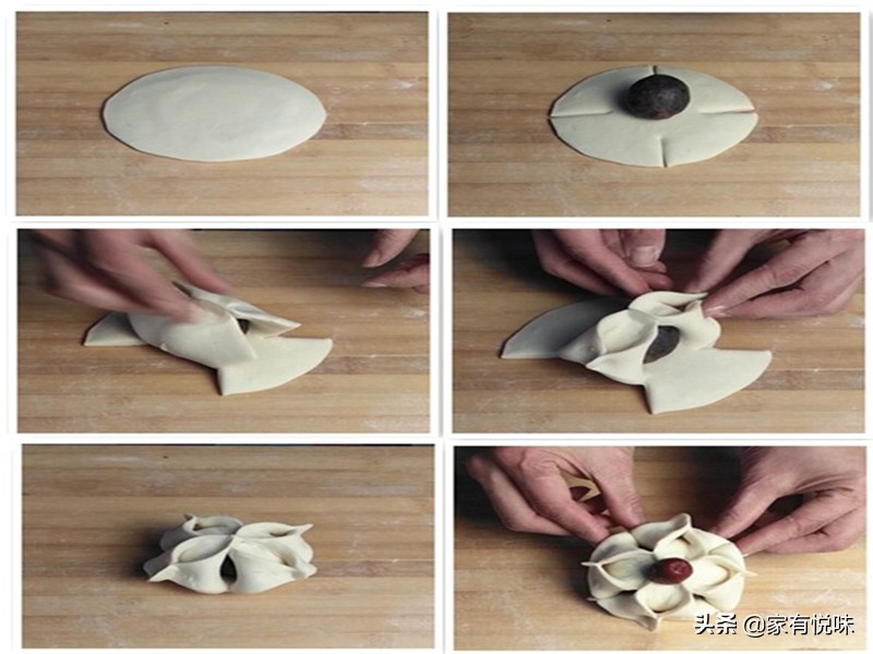 1、 将揉圆的面剂擀成中间稍厚,边缘稍薄的包子皮,放入事先准备好的豆沙馅,然后如图这样分割。