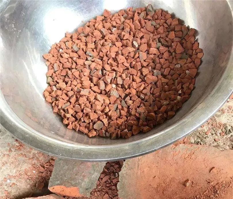 红砖颗粒的制作也很简单,只要我们收集几块老砖,用锤子把它敲成小碎块,碎块大约黄豆大小,混合到植料中就可以了。红砖颗粒在兰花植料中的占比通常在20%~40%。