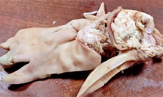2.将羊头捞出,放入盛有温水的盆内,再次清洗干净后,沥干水分,放在案板上,用刀将羊头上的肉切下来,然后切成长条。