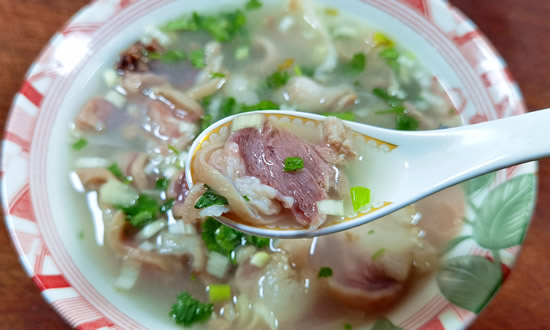 4.羊肉煮至软烂后关火,将所有调味料取出,将羊肉捞出,装入大碗中,舀入适量的羊肉汤,加入适量的盐、香醋和胡椒粉,撒上适量的香菜和葱花,加入少许辣椒油,即可食用。