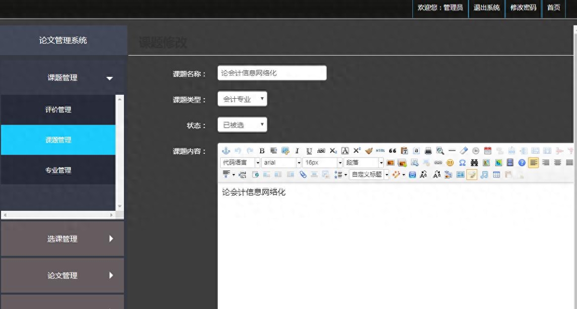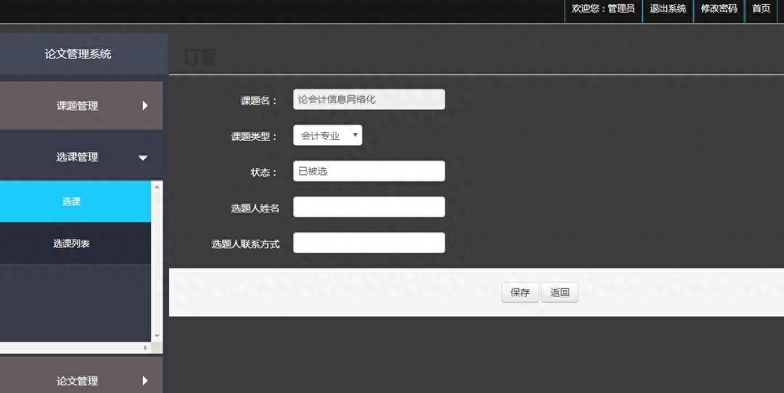 后台管理:登录、注册、评价的增删改查、课题的增删改查及查看选课情况、 选课期刊的查询删除、专业的增删改查,后台选题、成绩的增删改查、 用户的添加删除修改、角色的添加删除修改、菜单的添加删除修改。