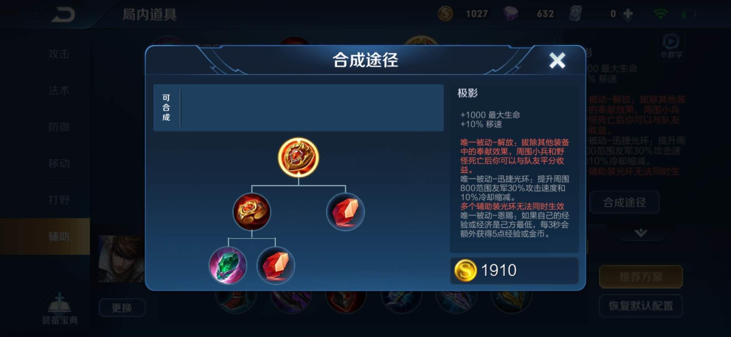 辅助:凤鸣指环(唯一主动技能释放周围友军6%的cd缩减)、极影(唯一主动技能释放周围友军10%的cd缩减)