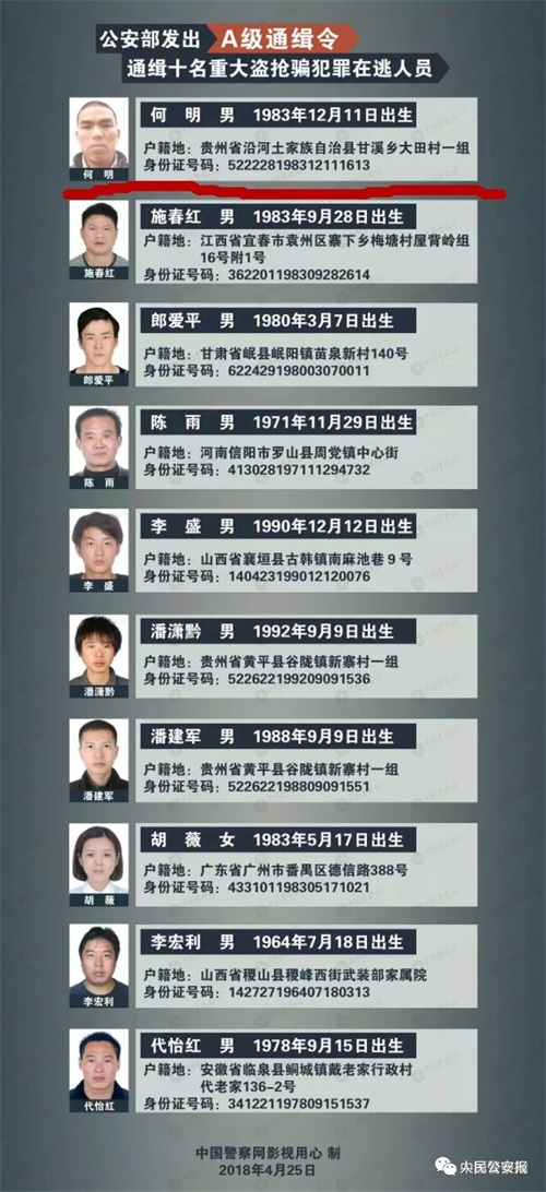 今年4月25日,公安部发布A级通缉令对包括何明在内的10名重大盗抢骗犯罪在逃人员进行公开通缉。