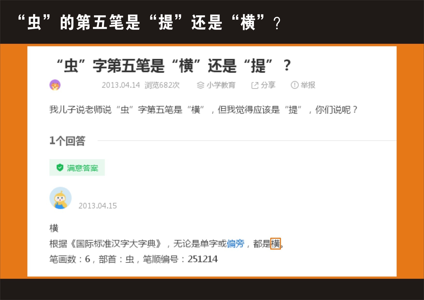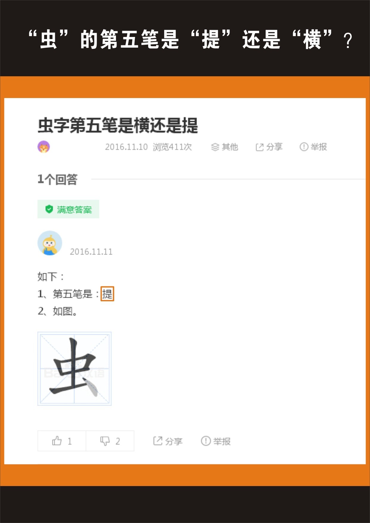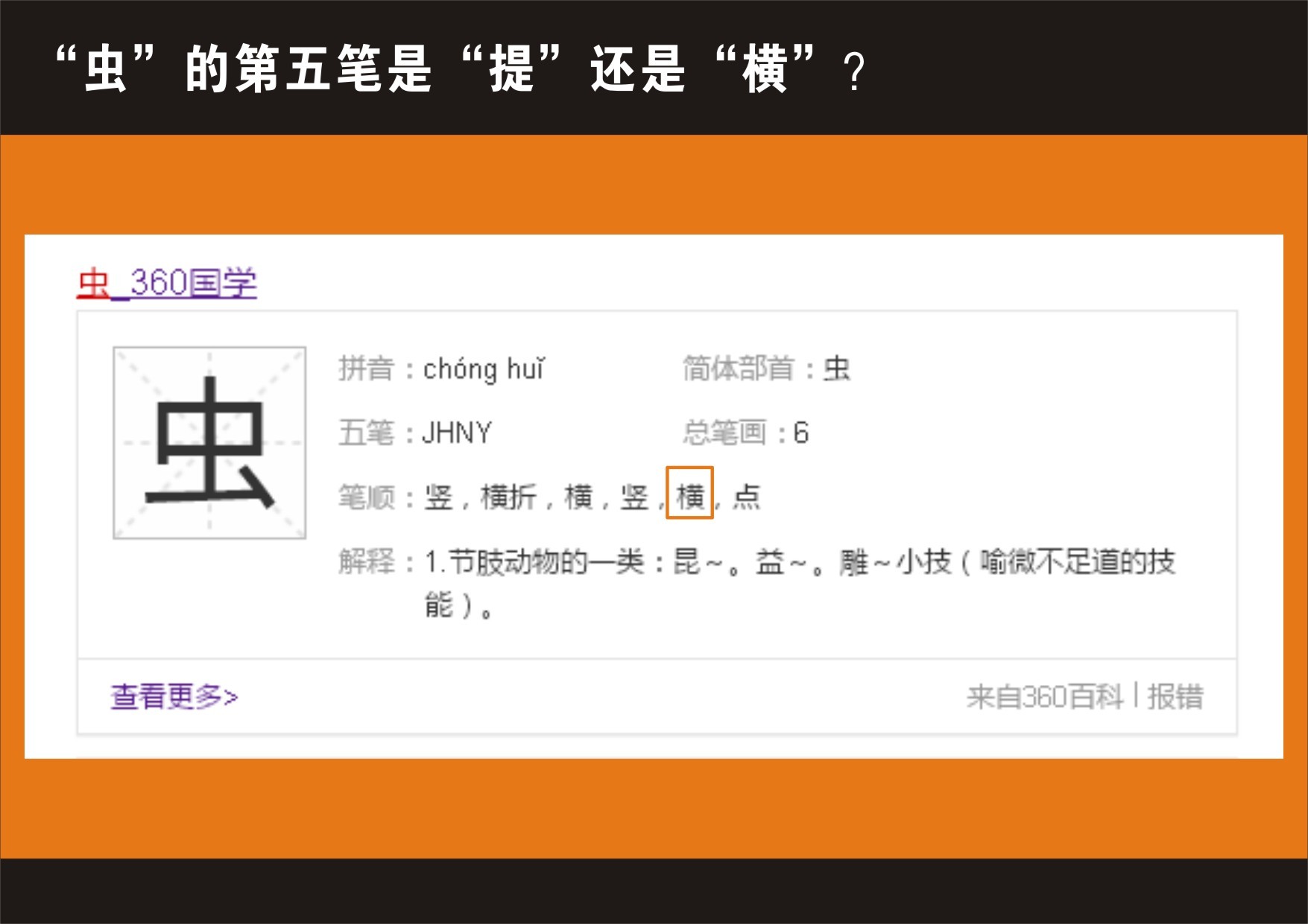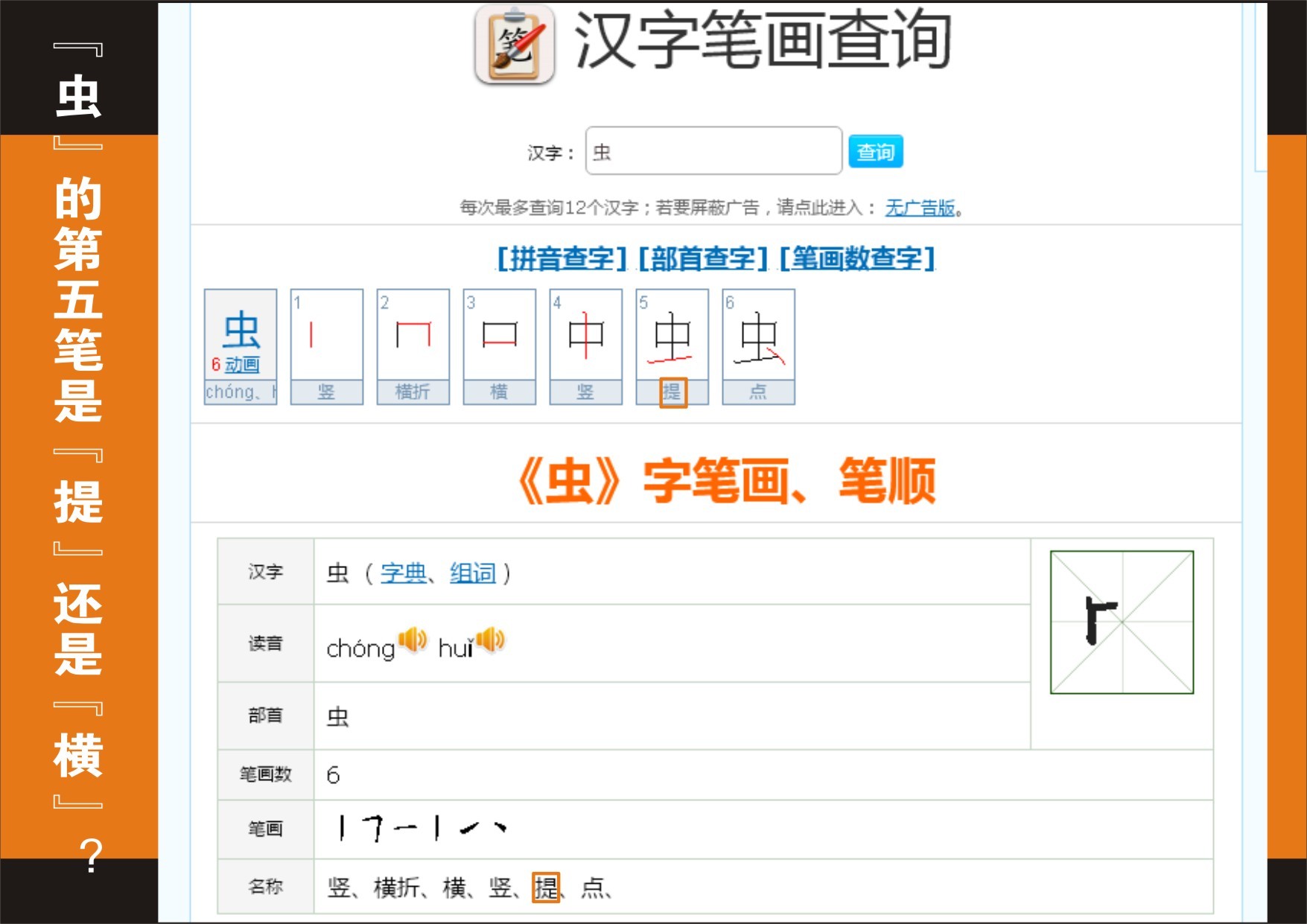 我本人不太懂,平时写“虫”写的也不是很正规,写的字上不了台面,所以我就去网上寻找答案,上网查了之后,我更迷糊了,因为“第五笔是提”、“第五笔是横”的答案都有。