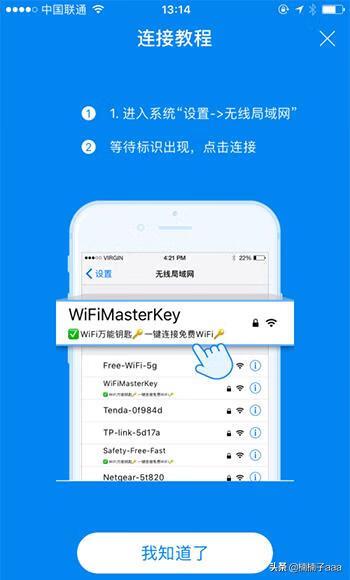 3、打开后,WiFi万能钥匙将会自动扫描你周围的Wifi热点。点击需要连接的WiFi,会出现连接的教程,教程的步骤如下图。