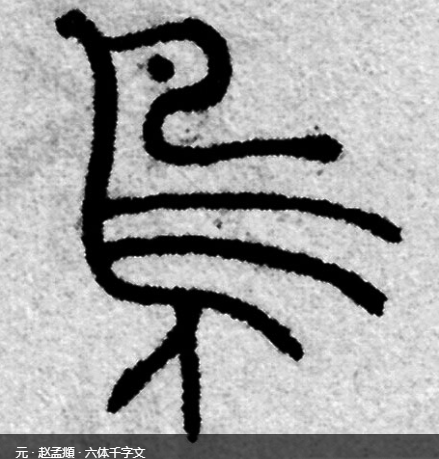 当然,上面只是“鸟”的其中两种写法,其他还有很多复杂的样式。但文字为文字,图画为图画,在大量的书写中,象形的图画文字也慢慢开始演变为更适合书写的形式。如下图赵孟頫借鉴的一种书写样式,有简单的形象概括,又不失书写的美感。这个样式和小篆的“鸟”很相近。