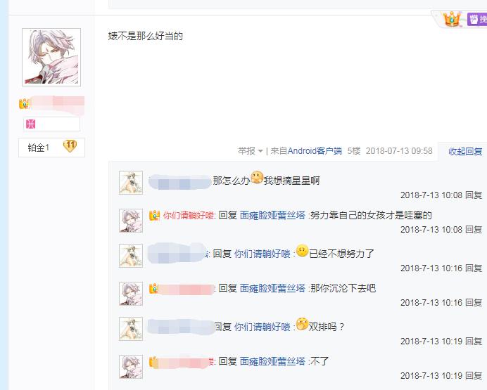 在这名女玩家发出这段语不惊人死不休的话后,回复的玩家分为了两派,一派是劝谏,就如这名玩家劝谏道:婊不是那么好当的,女玩家却说:想要上星,劝谏者再次劝道:努力靠自己的女孩才是最棒的,而女玩家却表示:已经不想努力了。劝谏者也只能微微叹息道:那你就沉沦下去把。女玩家尽然还舔着脸问双排吗?这名劝谏者只能说句不了,黯然离场。