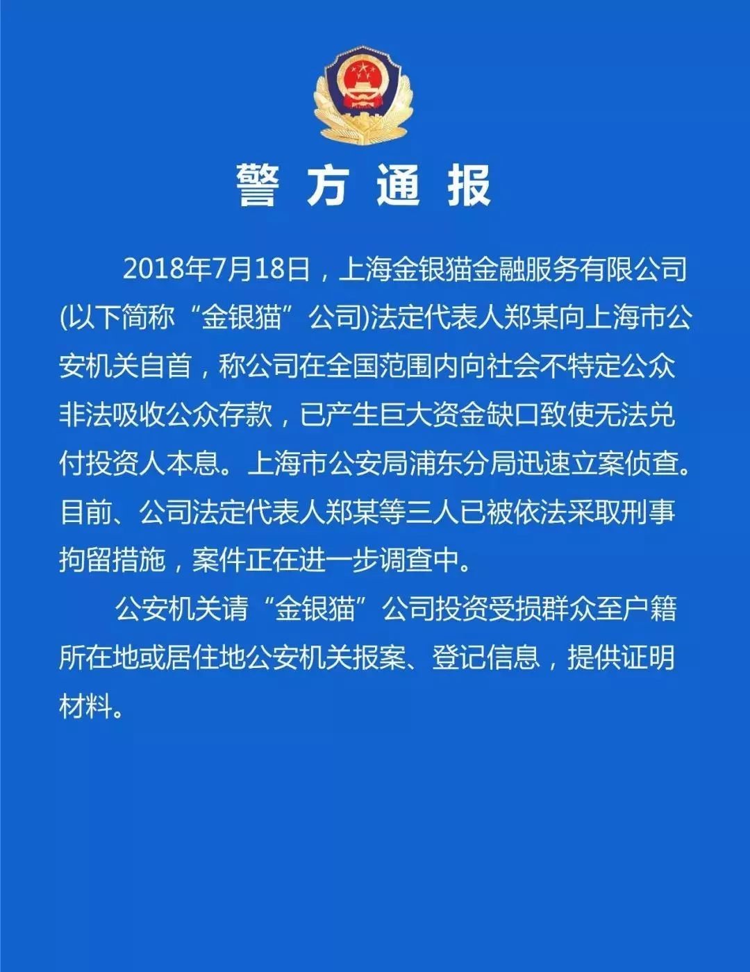 近日,上海市公安局浦东分局官方微信号“警民直通车浦东”发布通报称,上海金银猫金融服务有限公司(下称金银猫)法人郑某已于7月18日向上海警方自首,称公司在全国范围内向社会不特定公众非法吸收公众存款,已产生巨大资金缺口致使无法兑付投资人本息。对此,上海警方迅速立案侦查。目前,金银猫法人郑某等三人已被依法采取刑事拘留措施,案件正在进一步调查中。