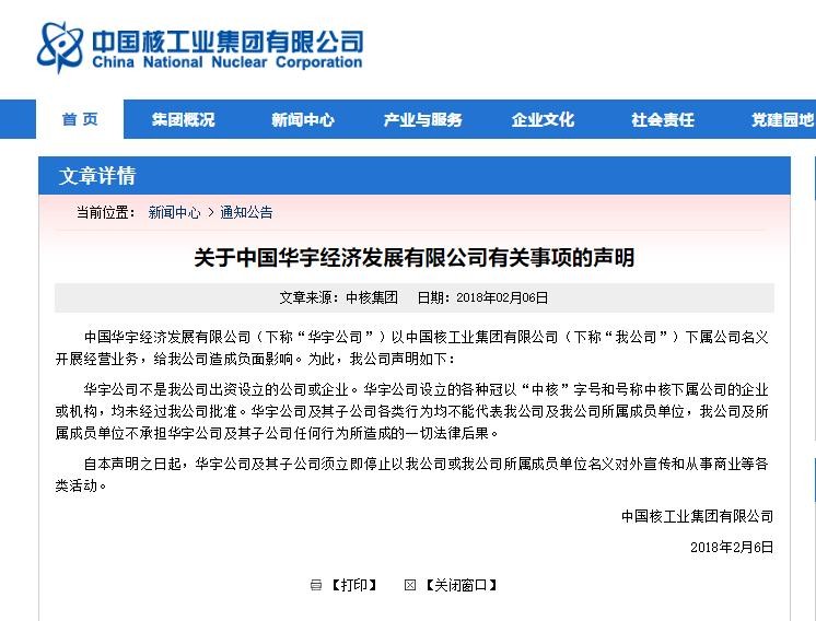 中核集团指出,华宇公司设立的各种冠以“中核”字号和号称中核下属公司的企业或机构,均未经过中核集团批准,其“各类行为均不能代表我公司及我公司所属成员单位,我公司及所属成员单位不承担华宇公司及其子公司任何行为所造成的一切法律后果。”