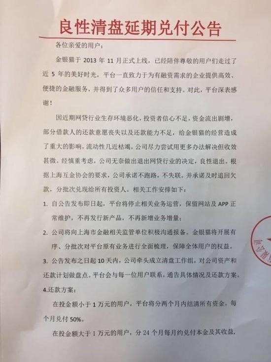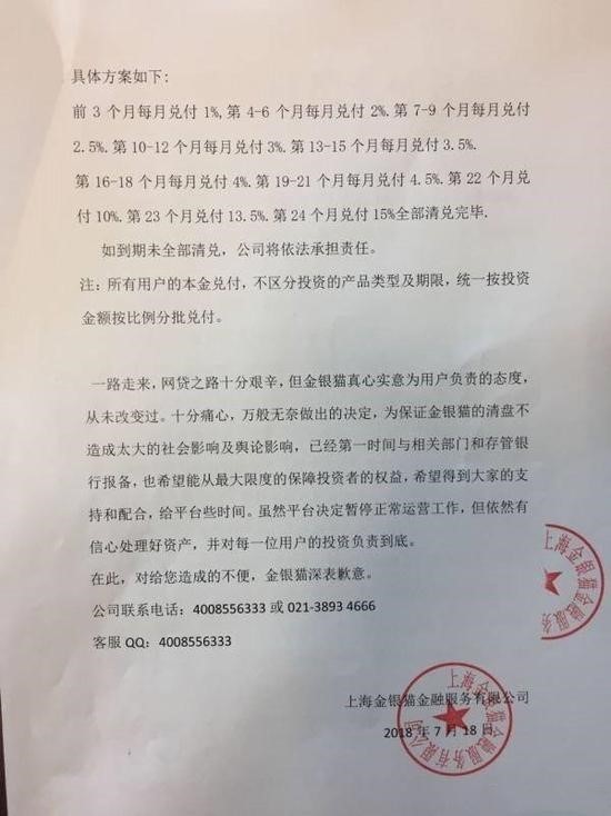 界面新闻注意到,此前7月18日,金银猫发布公告,宣布退出P2P业务,进行清盘。并称在公告发出10日内盘点公司资产,资金分批兑付。公告称,对在投金额小于1万元的用户,分两月结清,每月50%;在投大于1万元,分24个月,按比例完成兑付。