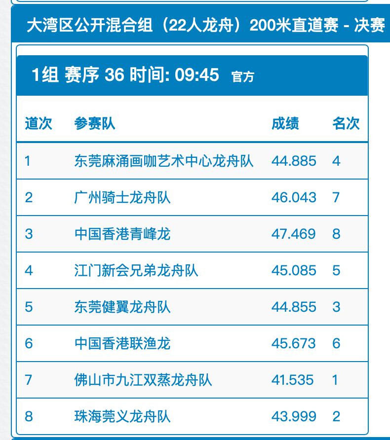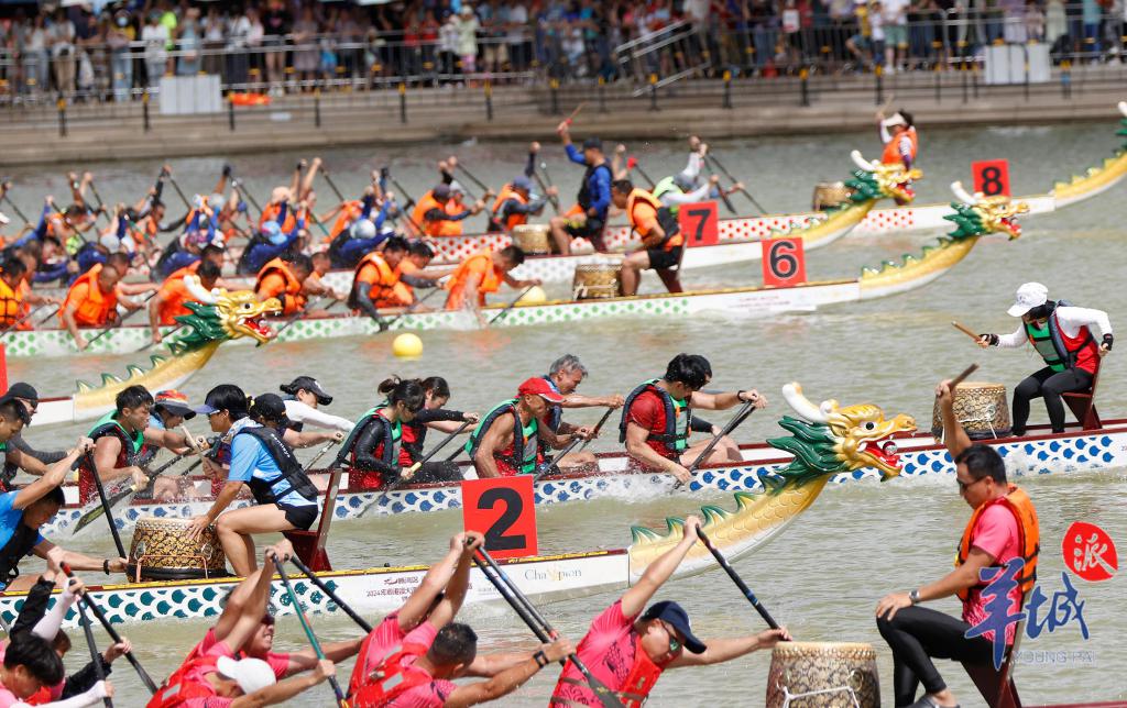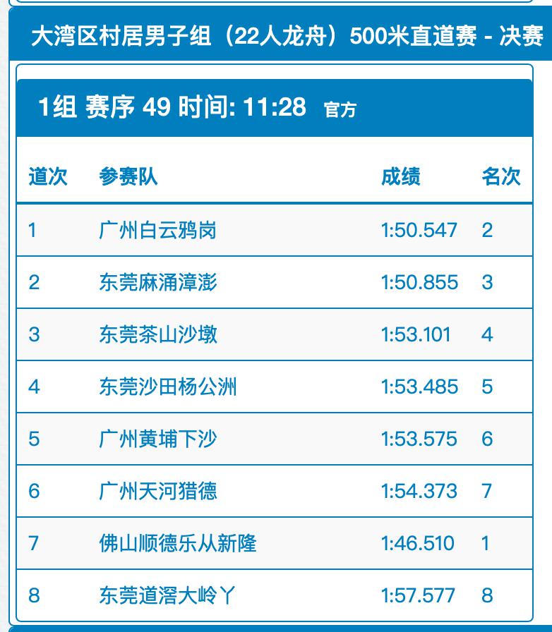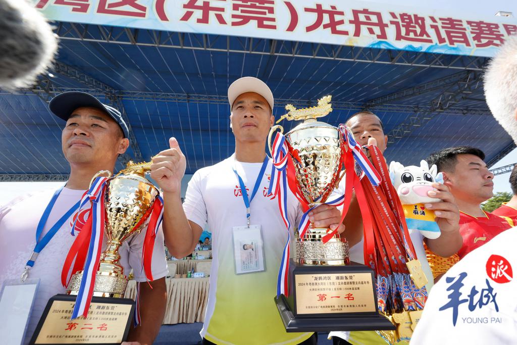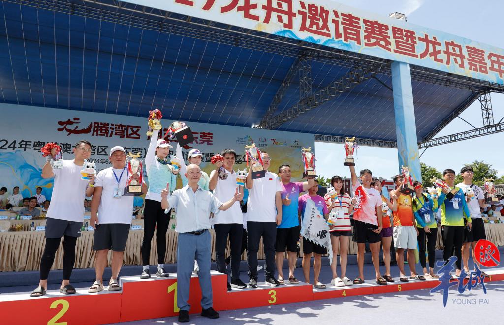 东莞麻涌漳澎获得大湾区村居男子组(龙王杯)200 米直道赛冠军,佛山顺德乐从新隆获得大湾区村居男子组(龙王杯)500 米直道赛冠军。佛山顺德乐从新隆获得大湾区村居男子组(龙王杯)总成绩冠军,捧得龙王牌匾。葡国联队获国际公开混合组(22 人龙舟)200 米、500 米直道赛冠军。