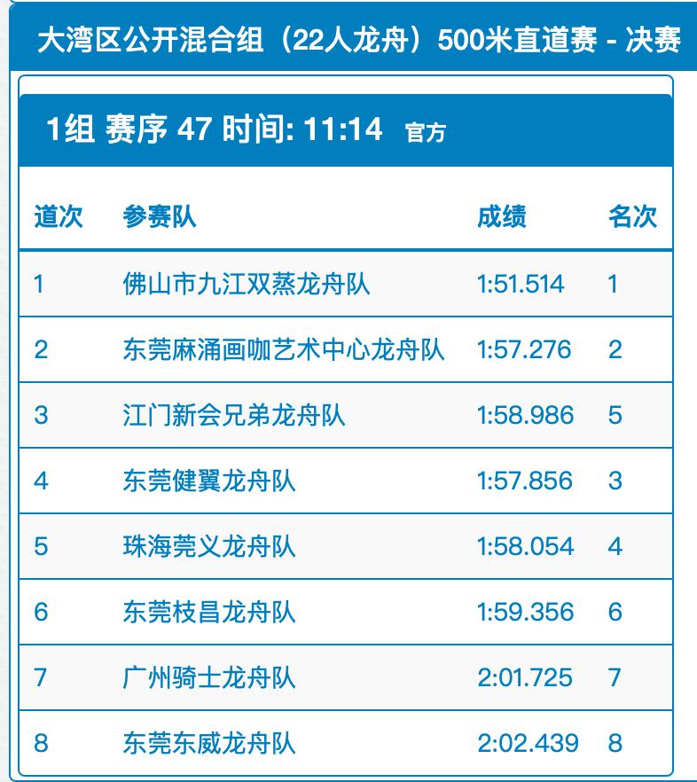 经过激烈的角逐,佛山市九江双蒸龙舟队获得大湾区公开混合组(22 人龙舟)200 米直道赛、大湾区公开混合组(22 人龙舟)500 米直道赛双冠军。珠海莞义龙舟队、东莞健翼龙舟队分别获大湾区公开混合组 200 米直道赛亚军、季军。东莞麻涌画咖艺术中心龙舟队、东莞健翼龙舟队分别获大湾区公开混合组 500 米直道赛亚军、季军。