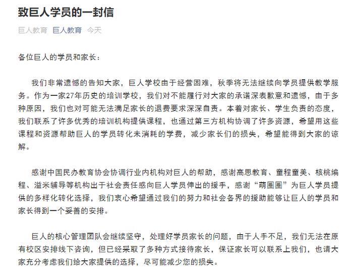 巨人教育称,已联系了许多优秀的培训机构提供课程,也通过第三方机构协调了许多资源,“希望用这些课程和资源帮助巨人的学员转化未消耗的学费,减少家长们的损失,希望能得到大家的谅解。”