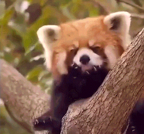 小熊猫对气温变化非常敏感,天气一热就会摊开四肢趴在树枝上休息,天气转凉的时候,就用自己长长的大尾巴当游戏被子。