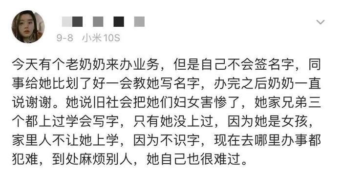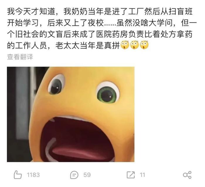 也有网友从奶奶那听说,奶奶过去也是旧社会的文盲,从参加扫盲班到进夜校,最后成了医院药房的工作人员。