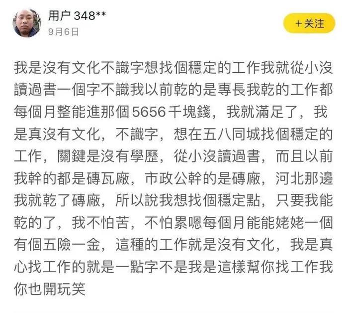 在某平台的众多求职帖里,一位大哥发布的内容语序颠倒,口语化严重,明显是借助了语音转换文字的功能。