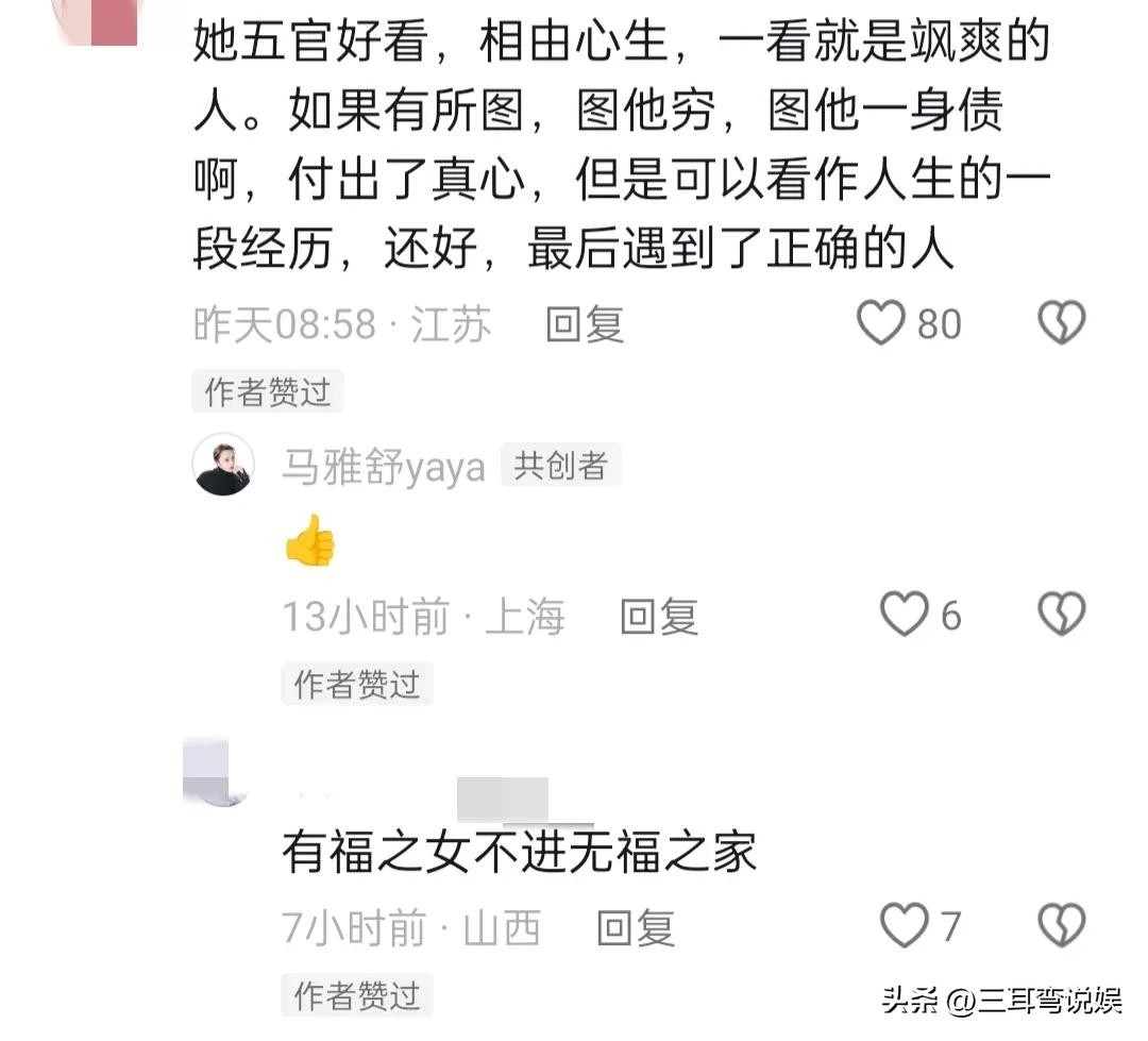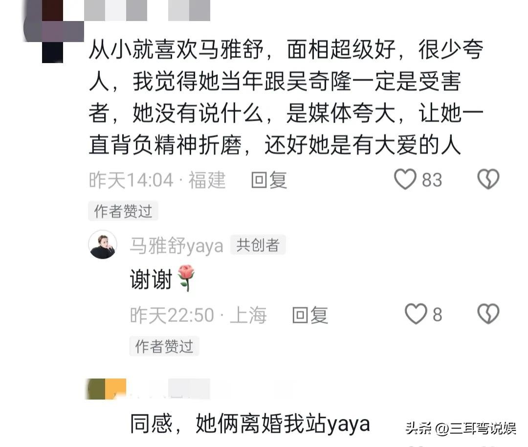 还有网友说她之前说吴奇隆的都是真的,离婚一定是吴奇隆让马雅舒失望了,反正现在吴奇隆刘诗诗传离婚,映射到当初离婚也肯定是吴奇隆不对,而马雅舒点赞不就是给人赞同的意思吗?