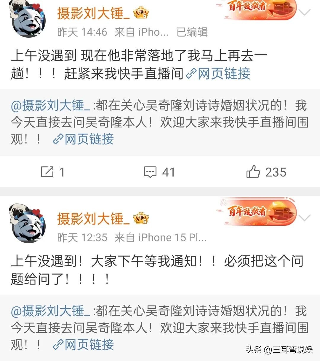 刘大锤在吴奇隆和刘诗诗曝出离婚上热搜的当天下午就去拍了,结果没拍到两人,只拍到吴奇隆爸爸和刘诗诗助理一起在带娃。